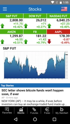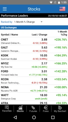 Barchart Stocks, Futures and Forex is the most complete financial app currently available, featuring free real-time stock prices. Track stocks, futures, forex markets, ETFs & indices. In-depth coverage on every symbol (including charts, technicals, fundamentals, opinions) is available at your fingertips on our advanced Favorites Lists, making it easy for investors and market followers to track and watch the markets.